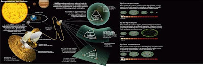 A partir de observaciones del Fondo Cósmico de Microondas, la misión WMAP ha determinado, con un margen de error del 0,5%, que el universo es plano. “Si dibujas un triángulo enorme en la superficie de la Tierra, la suma de los ángulos será mayor a 180 grados, porque es curva. La misión espacial WMAP ha hecho el mismo razonamiento en tres dimensiones: sobre un triángulo tridimensional que se extiende sobre vastas regiones del espacio ha mostrado que la naturaleza del espacio es euclídea, es decir, que su curvatura es cero”, afirma Charles Bennett.